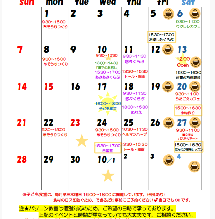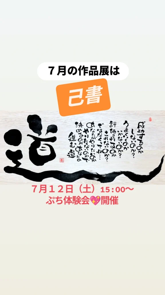 新しく始まる「己書」講座に合わせ、講師であるすーちゃんの作品展を開催しています! 7月12日(土) 午後3時から「ぷち体験会」を開催します(参加費1000円+ワンドリンク注文)楽しく集中できる時間です…